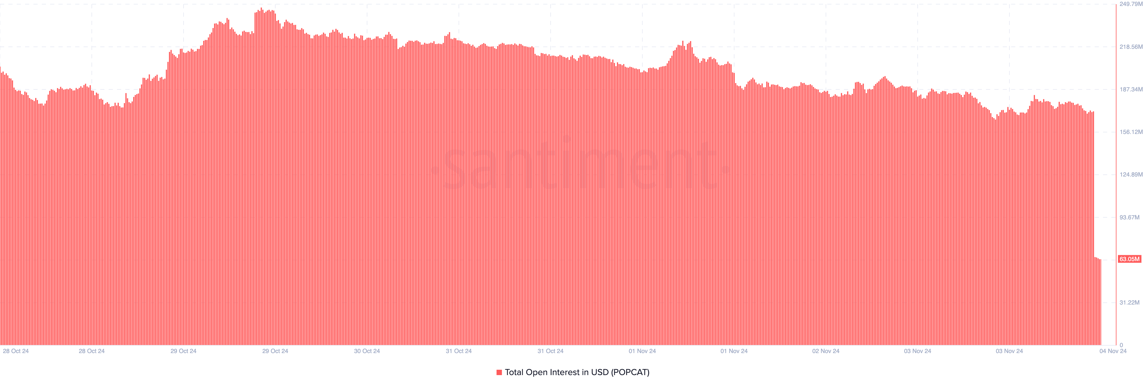 Un calo dell’OI indica che i trader stanno chiudendo sempre più le loro posizioni, il che è ribassista per la criptovaluta coinvolta. Nel caso di Popcat, l’OI in calo combinato con la diminuzione del prezzo suggerisce che una ripresa sarà difficile per il memecoin, rendendo improbabile un aumento a USD 2 nel breve termine.