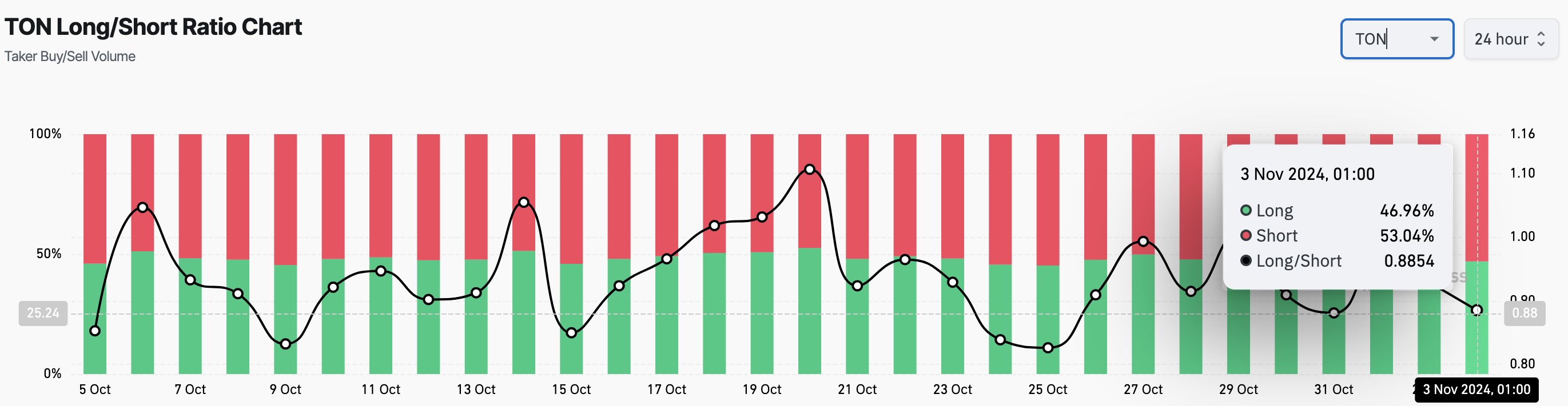 Il portale di informazioni sui derivati Coinglass mostra che il rapporto Long/Short di Toncoin è sceso a 0,88. Il rapporto Long/Short è una metrica usata per valutare l’equilibrio tra trader posizionati al rialzo (acquirenti) e al ribasso (venditori) nel mercato.