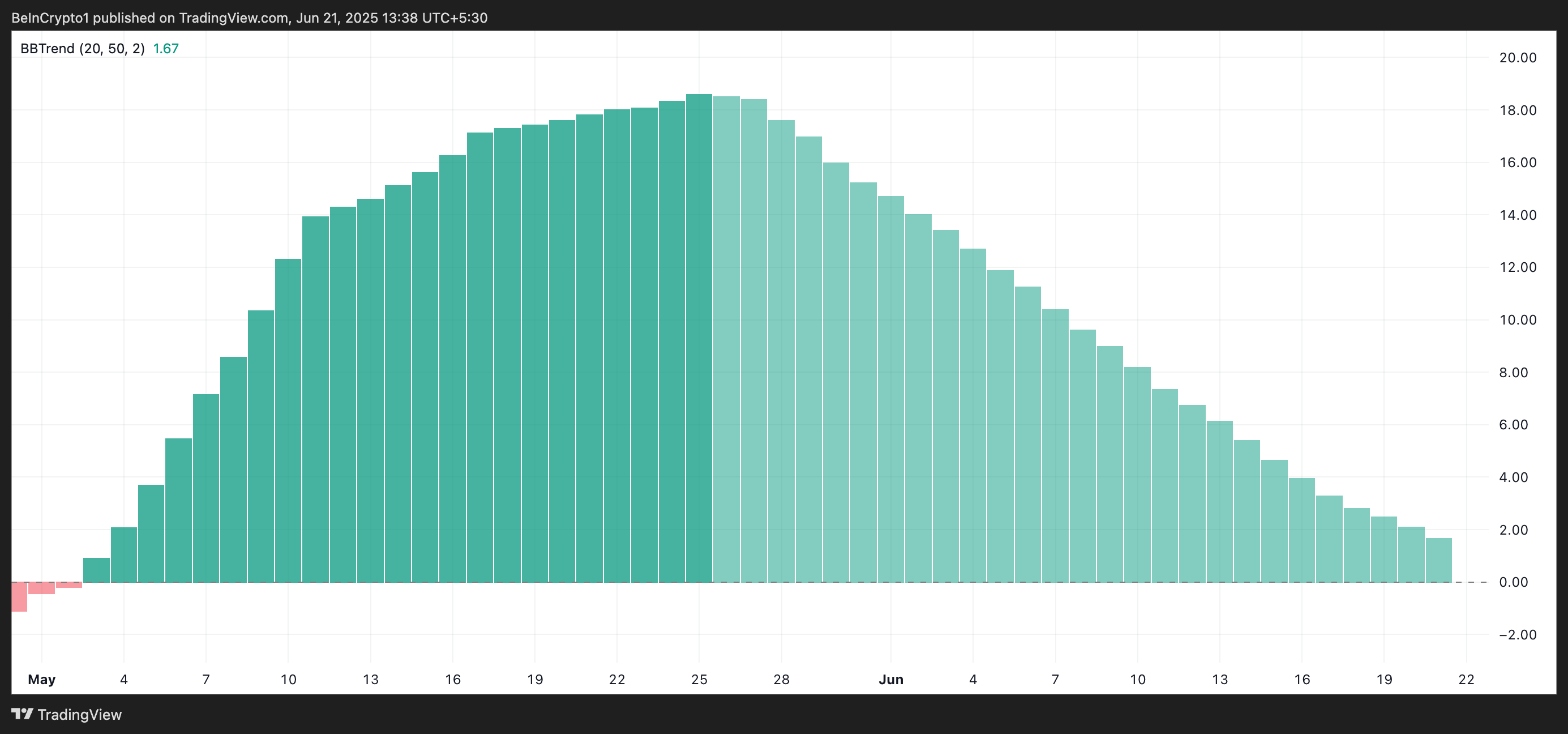 Quando il BBTrend diventa negativo o le barre verdi si riducono, il momentum rialzista sta svanendo e l’asset potrebbe entrare in una fase di consolidamento o affrontare un’inversione.