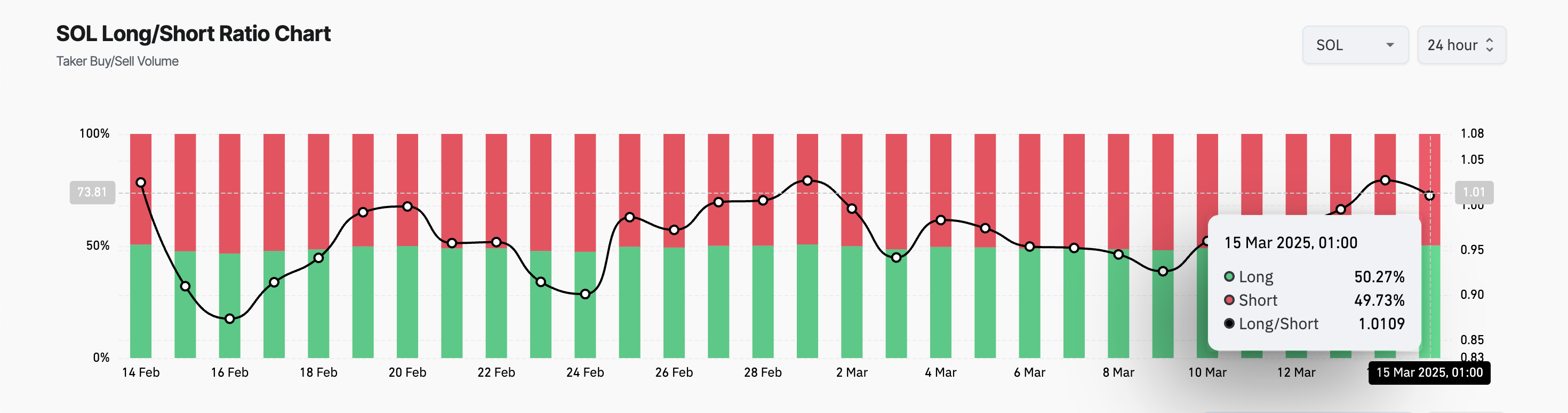 Il rapporto long/short di Solana evidenzia la rinascita del trend rialzista verso l’altcoin. Al momento della pubblicazione, questo è pari a 1,01.