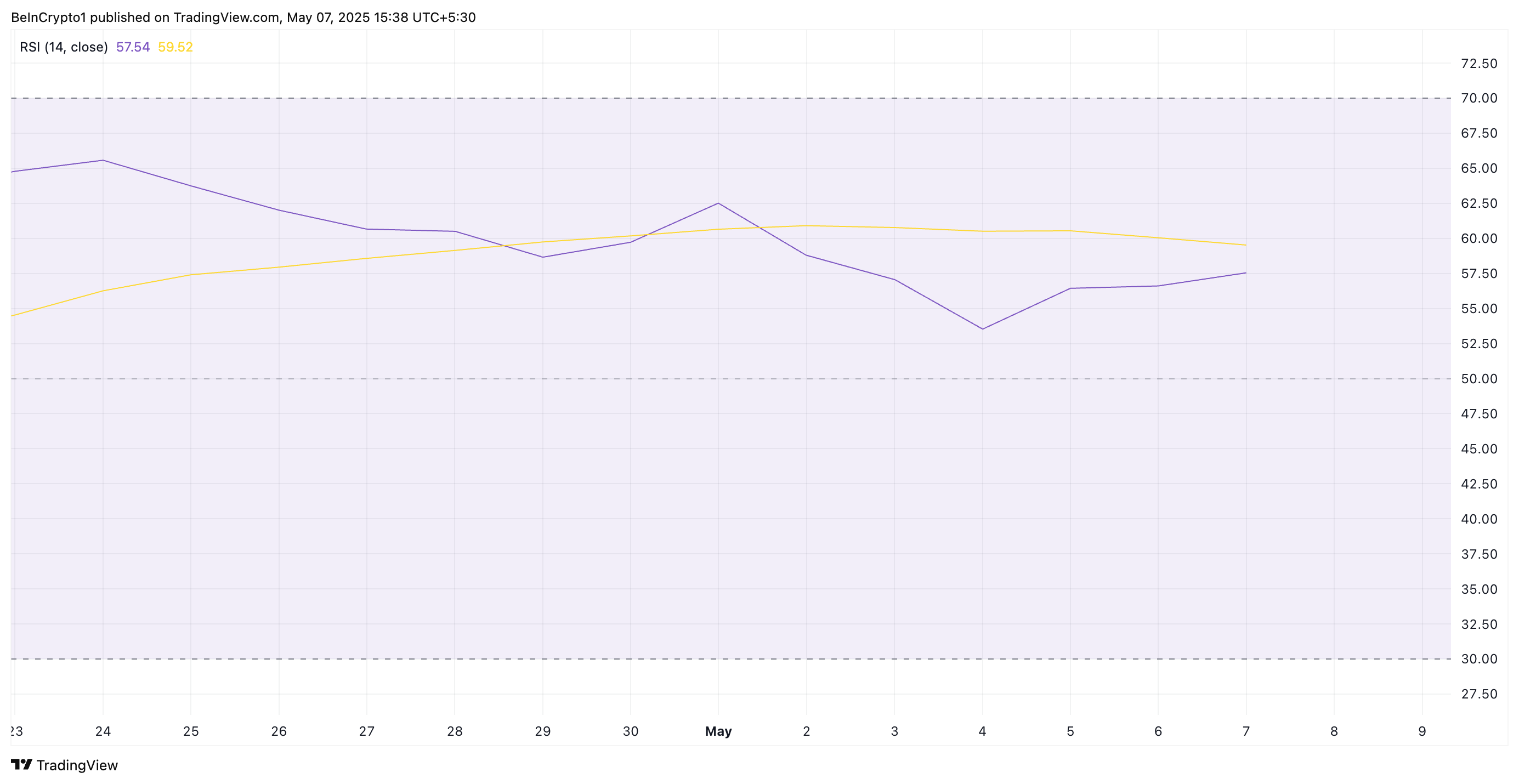 L’indicatore RSI misura le condizioni di mercato di ipercomprato e ipervenduto di un asset, variando da 0 a 100. Valori superiori a 70 segnalano tipicamente che un asset è ipercomprato, mentre un RSI inferiore a 30 indica ipervenduto.
