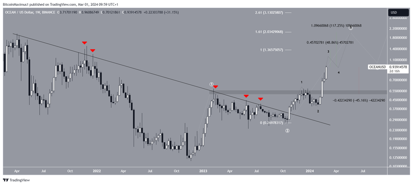 Il conteggio più probabile suggerisce che OCEAN si trovi nell’onda tre di un movimento ascendente a cinque onde. Se il conteggio è corretto, il prezzo di OCEAN può salire fino alle prossime resistenze a 1,36 o 2,03 dollari. La prima darebbe alle onde uno e tre un rapporto di 1:1, mentre la seconda darebbe loro un rapporto di 1:1,61.