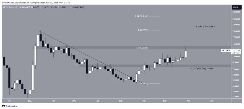 Il prezzo di APT è aumentato da quando è uscito dalla linea di tendenza discendente di resistenza a lungo termine nel novembre 2023. L’aumento è stato parabolico e ha portato a un massimo di 13,60 dollari questa settimana. APT ha raggiunto la confluenza dei livelli di resistenza di 12,60 dollari, creata da un’area di resistenza orizzontale e dal livello di resistenza di ritracciamento 0,5 Fib, la resistenza finale prima del massimo storico di 20,55 dollari.