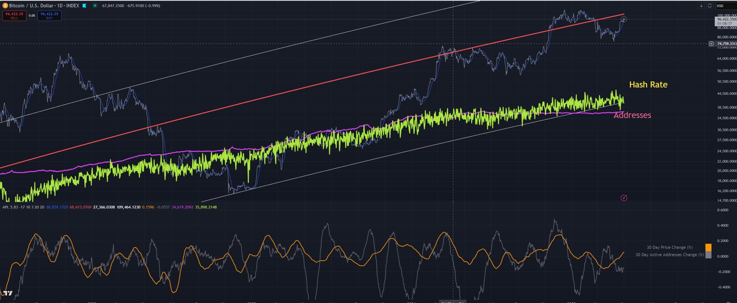 Riflettendo la prospettiva di Breedlove22, un altro utente di X ha condiviso che la valutazione di BTC basata sul tasso di hash è a un livello di supporto, suggerendo che un minimo locale potrebbe essere stato raggiunto.