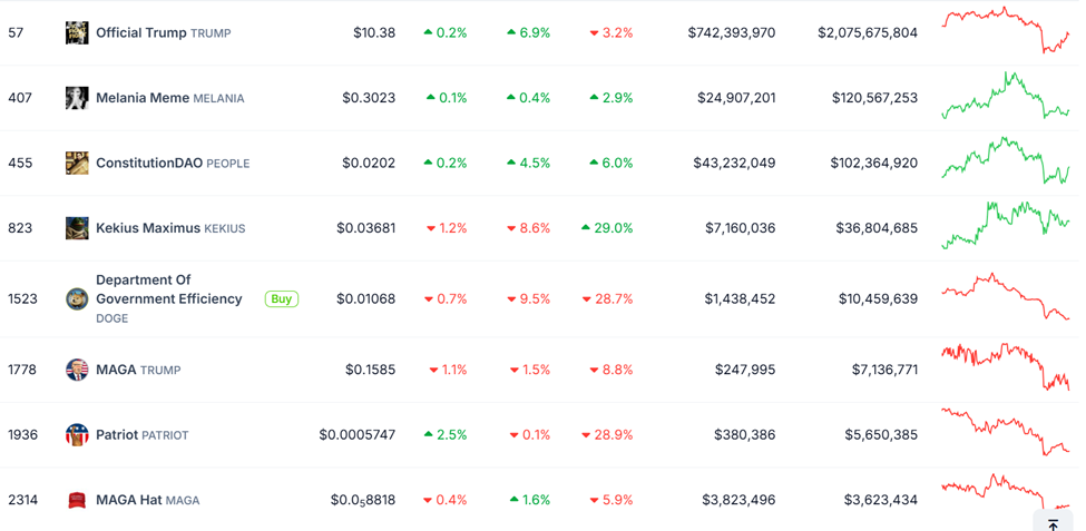 Infatti, i dati di diversi tracker di token mostrano un volume retail che esce in massa dai token a tema politico.