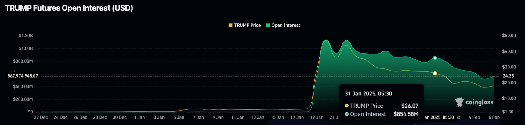 L’Open Interest in TRUMP è sceso del 33%, passando da 854 milioni USD a 567 milioni USD. Questa riduzione di 287 milioni USD segnala una fiducia in calo tra i trader. Il significativo ritiro di capitale indica che molti stanno uscendo dalle loro posizioni, riducendo la liquidità e amplificando la pressione ribassista.
