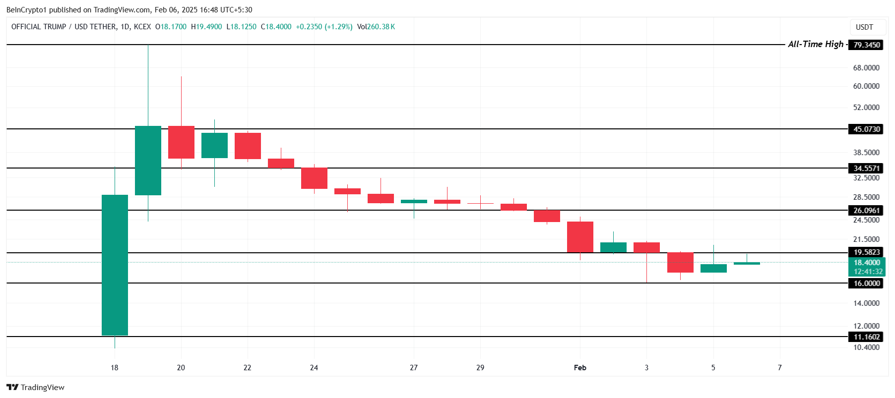 TRUMP è attualmente scambiato a 18.40 USD, lottando sotto la resistenza critica di 19.58 USD. Tuttavia, rimane sopra il suo livello di supporto chiave di 16.00 USD. L’obiettivo immediato dell’altcoin è riconquistare 20.00 USD come livello di supporto stabile.