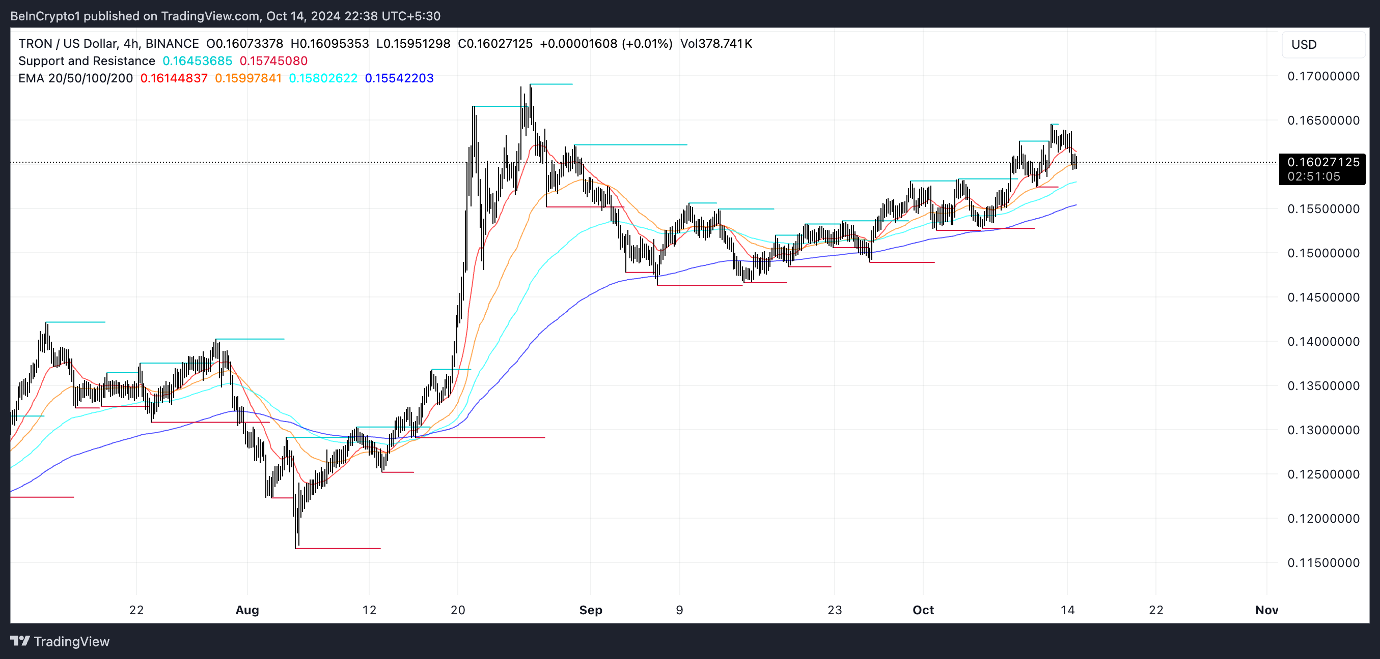 Se il trend rialzista continua, TRX testerà probabilmente le sue prossime resistenze a 0,166 USD e potenzialmente anche a 0,169 USD, suggerendo spazio per ulteriori guadagni se la pressione di acquisto si rafforza.