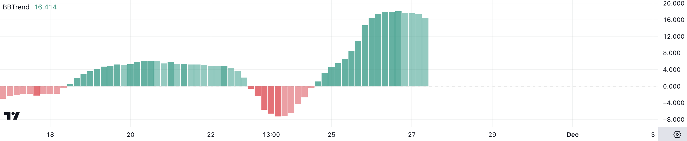 UNI BBTrend è attualmente a 16,5, rimanendo positivo dal 24 novembre dopo essere brevemente diventato negativo tra il 23 e il 24 novembre. Il BBTrend, o Bollinger Bands Trend, misura la forza e la direzione dei movimenti di prezzo rispetto alle Bande di Bollinger.