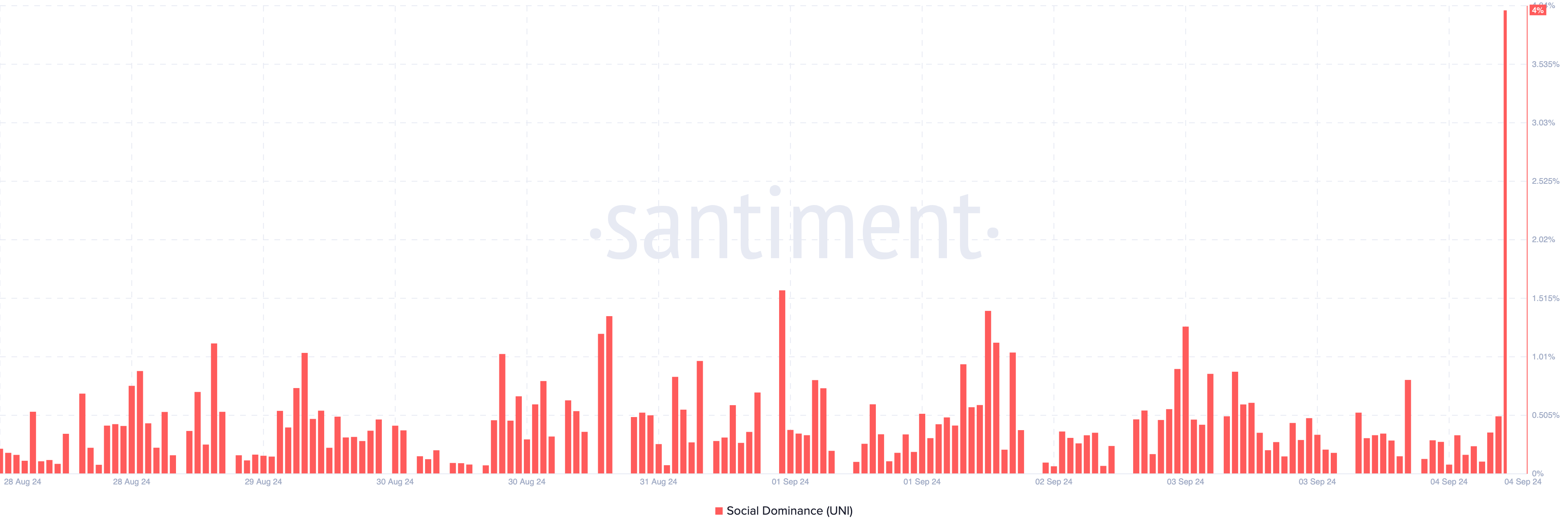 Nel caso di Uniswap, il dominio sociale è salito al 4%, indicando che le conversazioni sull’altcoin sono tra le più diffuse oggi. Importante, il dominio sociale è spesso collegato ai movimenti di prezzo, con un’attenzione maggiore che può influenzare il comportamento del mercato.