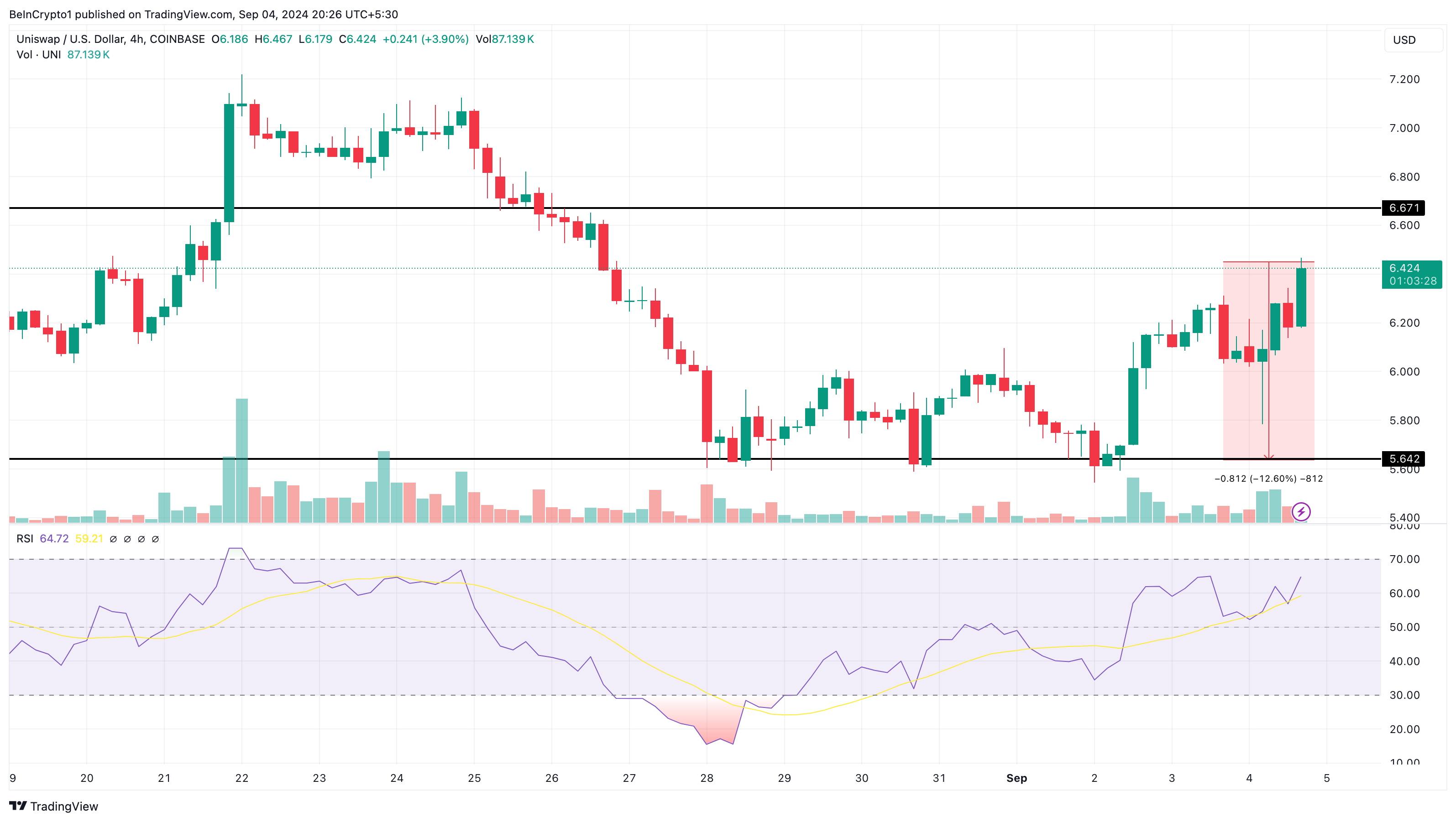 L’RSI è un oscillatore tecnico che misura il momento, ed è fondamentale per individuare condizioni di ipercomprato e ipervenduto. Valori superiori a 70,00 indicano che una criptovaluta è ipercomprata, mentre quelli a 30,00 o meno indicano che è ipervenduta. Al momento della stampa, UNI è scambiato a 6,45 USD, con un RSI di 64,77, indicando che si sta avvicinando alla zona di ipercomprato.