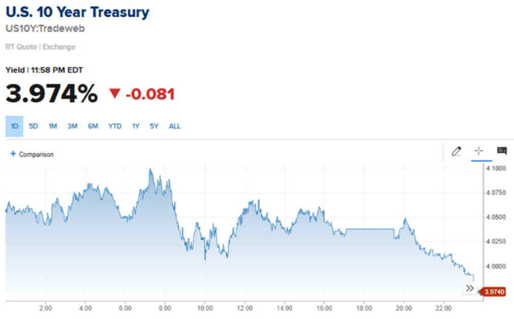 Il rendimento del Treasury statunitense a 10 anni è sceso sotto il 4% per la prima volta da ottobre.