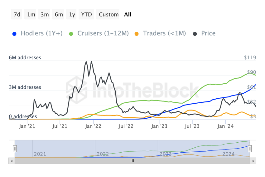 - Indirizzi per tempo detenuti: Questa metrica è suddivisa in titolari, crocieristi e trader. I titolari sono coloro che detengono un token da almeno un anno. I Cruiser sono coloro che hanno posseduto il token da uno a 12 mesi. Infine, i trader sono coloro che hanno effettuato acquisti negli ultimi 30 giorni.