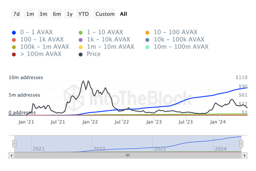 Al momento della stampa, il numero di indirizzi che detengono da 100.000 a 10 milioni di AVAX è aumentato. Un numero crescente di titolari con grandi quantità di token è un segno positivo per il prezzo. Per questo motivo, AVAX potrebbe resistere a ulteriori ribassi e iniziare a salire.