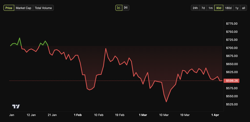 Nell’ultimo mese, il valore dell’altcoin è diminuito del 2,2%. Al momento della scrittura, BNB era scambiato a $598. Questo rappresentava un calo dell’1,7% nelle ultime 24 ore, secondo i dati di BeInCrypto.