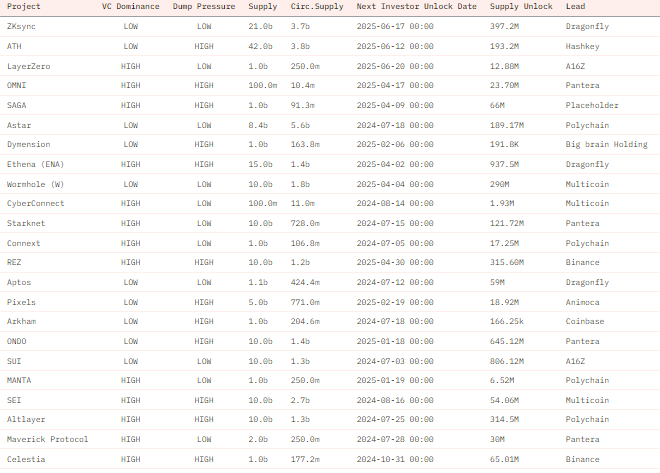 I possessori di token di Ethereum Name Service (ENA), Renzo (REZ), Ondo Finance (ONDO), Dymension (DYM), Saga (SAGA) e Celestia (TIA) potrebbero trovarsi su un terreno pericoloso. La piattaforma di dati Dune Analytics mostra che i VC sono seduti al 1,100% di profitto non realizzato su queste altcoin, creando un’elevata pressione di dump.