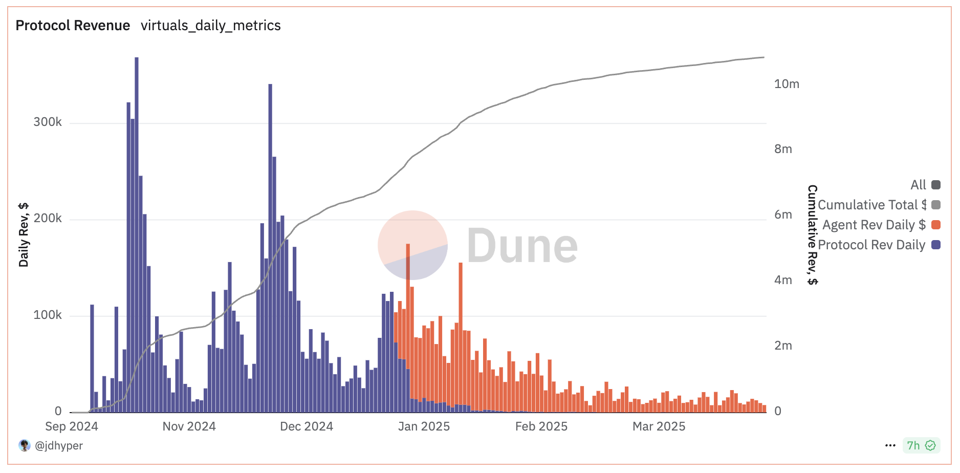 I dati del 10 aprile mostrano che il ricavo giornaliero per gli crypto AI agent di VIRTUAL ammontava a soli $7.677, mentre il protocollo stesso ha generato solo $137 nello stesso giorno—una cifra deludente per una piattaforma un tempo valutata quasi 5 miliardi di dollari in capitalizzazione di mercato.