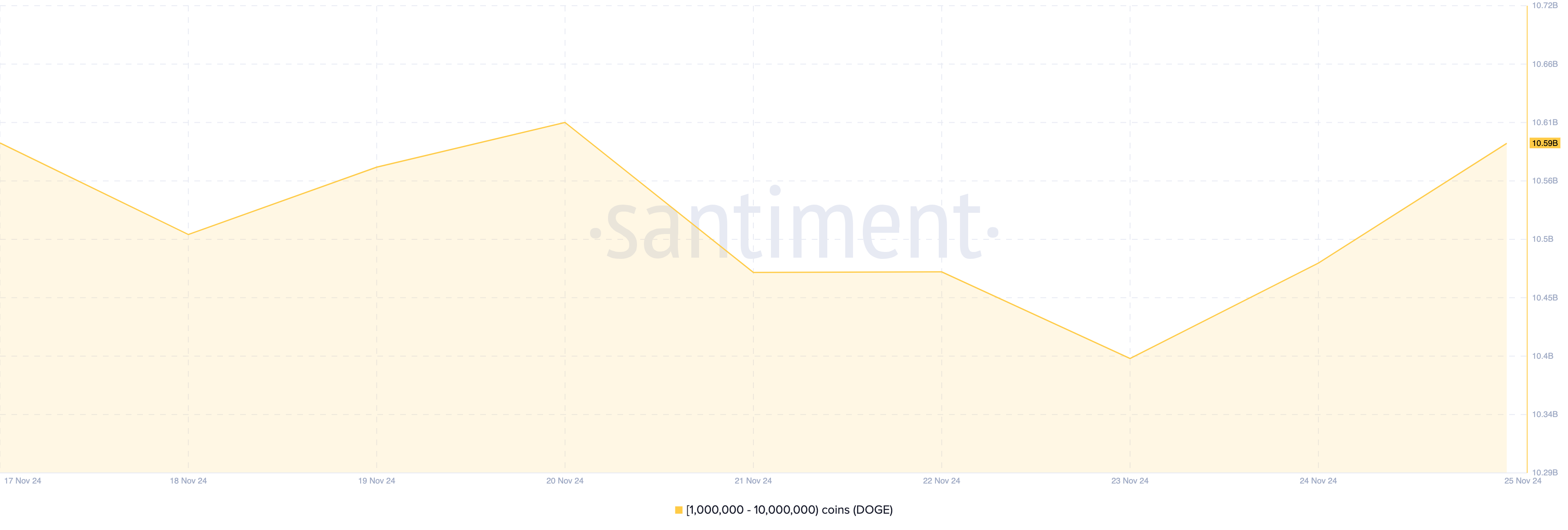Secondo Santiment, il saldo degli indirizzi che detengono tra 1 milione e 10 milioni di DOGE è sceso a 10,39 miliardi il 23 novembre, ma è poi salito a 10,59 miliardi.