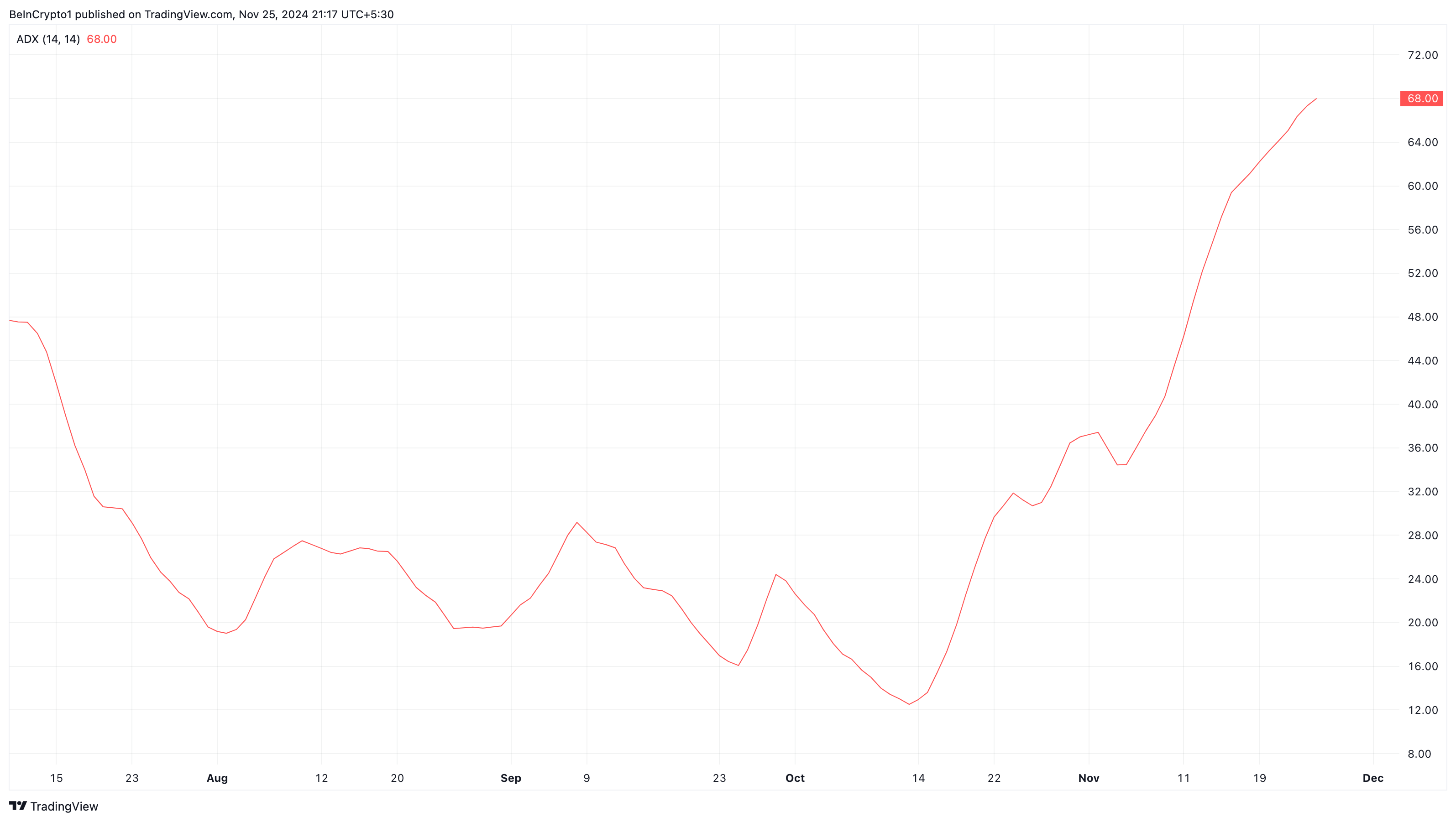 Inoltre, l’Average Directional Index (ADX) è in costante aumento. L’ADX è uno strumento di analisi tecnica che aiuta i trader a valutare la forza di un trend, sia rialzista che ribassista.