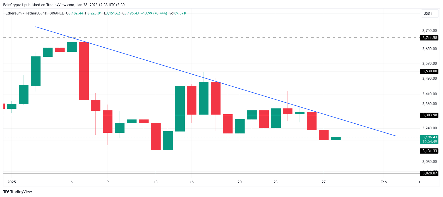 Al momento della scrittura, Ethereum era scambiato a 3.200 USD, rimanendo sotto la linea di tendenza ribassista per tre settimane consecutive. Nonostante la pressione ribassista, ETH si mantiene sopra il livello di supporto critico di 3.131 USD, che rimane un punto focale per i trader.