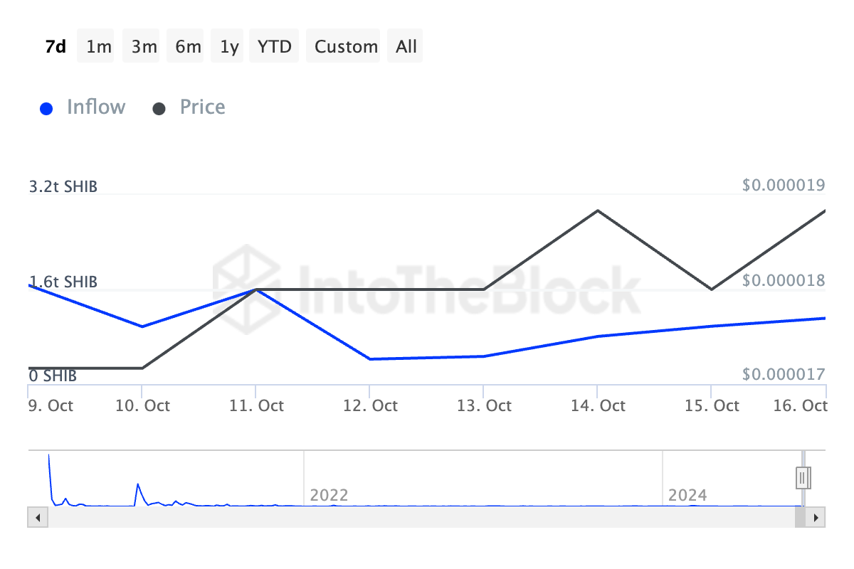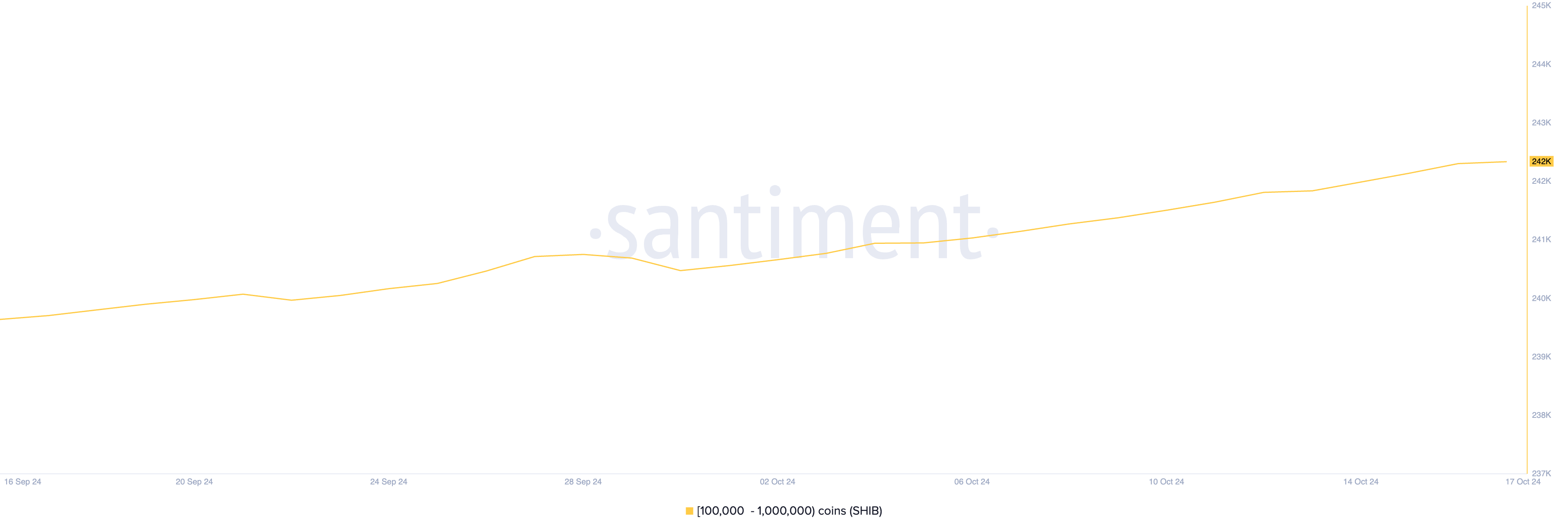 Secondo i dati di Santiment, il numero di whales di Shiba Inu che detengono tra 10.000 e 1.000.000 di token è aumentato dello 0,4% negli ultimi giorni.