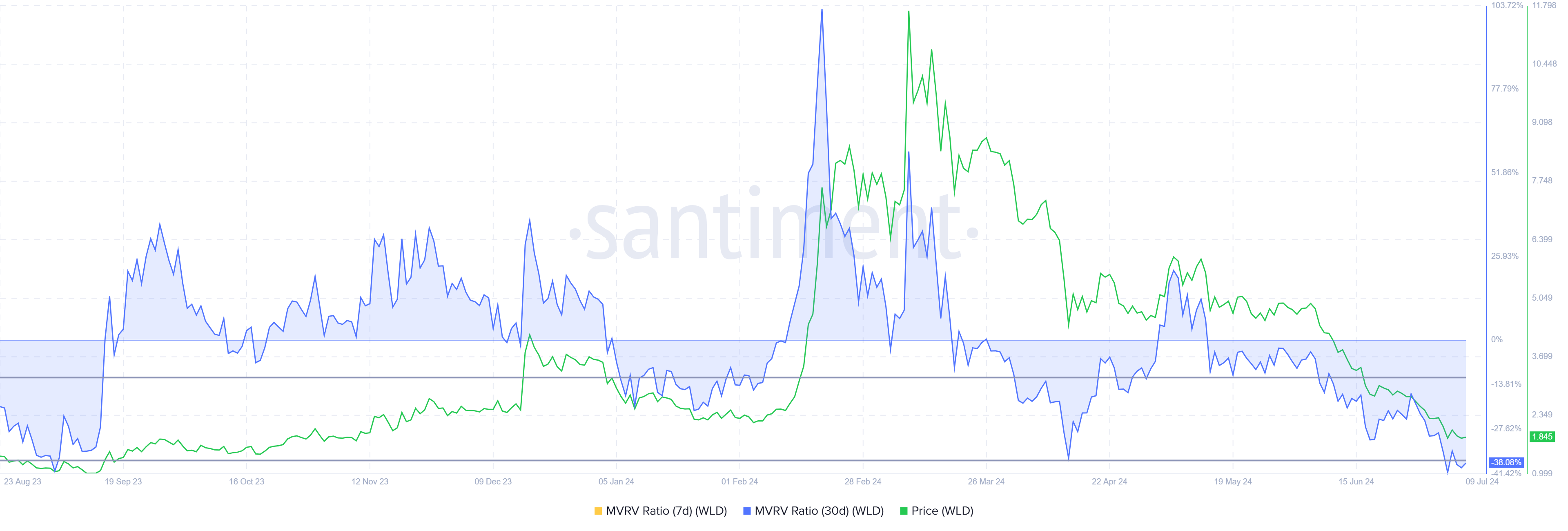 Secondo il rapporto tra valore di mercato e valore realizzato (MVRV), esiste un’opportunità di accumulo. Il rapporto MVRV valuta i profitti e le perdite degli investitori. Attualmente, l’MVRV a 30 giorni di Worldcoin si attesta a -37%, indicando una redditività che potrebbe portare a pressioni di acquisto.