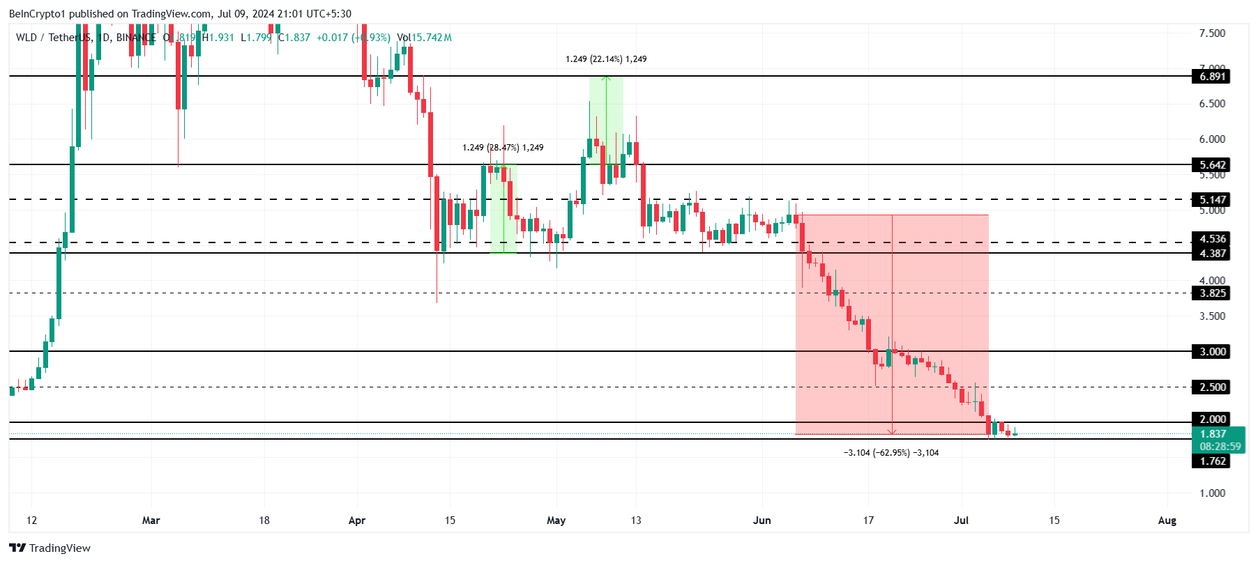 Il prezzo di Worldcoin è attualmente a 1,83 dollari, sotto il prezzo critico di 2,0 dollari. Dopo il calo del 63% registrato nell’ultimo mese, l’altcoin ha tentato di superarlo e di trasformarlo nuovamente in un supporto.