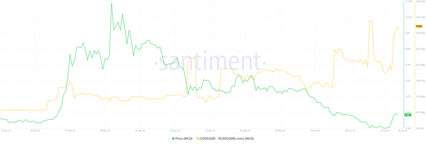 Lewhale di Worldcoin sembrano aumentare le loro scorte invece di venderle. Gli indirizzi che detengono tra 1 e 10 milioni di WLD hanno accumulato circa 13 milioni di WLD per un valore di oltre 36 milioni di dollari nell’arco di tre giorni.