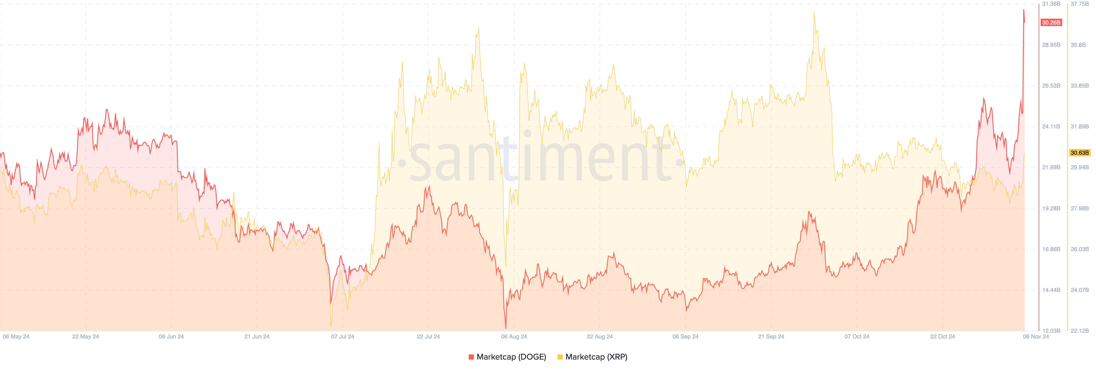 La capitalizzazione di mercato di XRP è salita a 30,63 miliardi di USD e rimane la settima criptovaluta più preziosa. Dogecoin, d’altra parte, è ottava con un valore di 30,26 miliardi di USD. Per contesto, la capitalizzazione di mercato è il prodotto del prezzo e dell’offerta circolante.