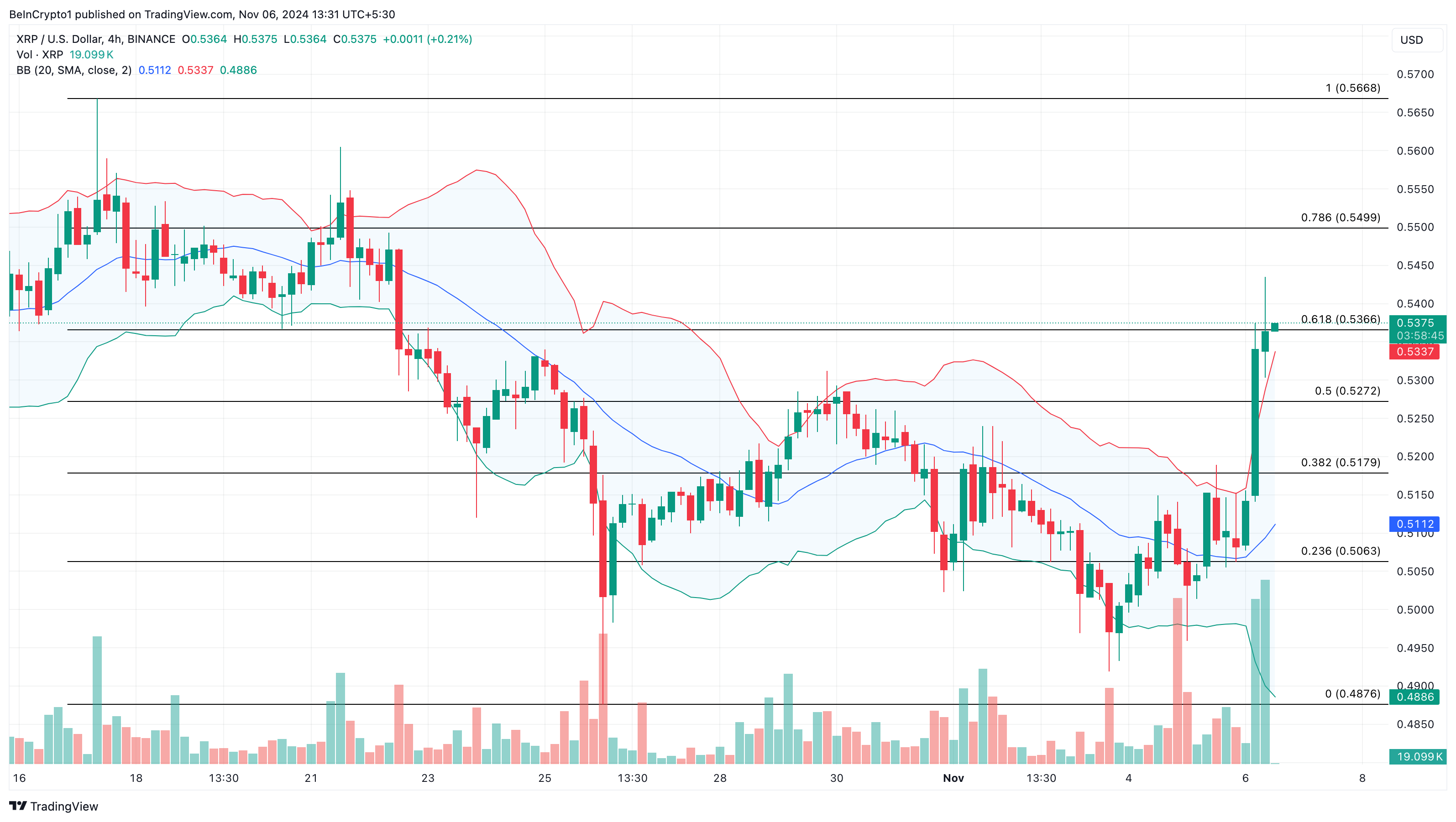 Uno sguardo al grafico a 4 ore mostra che le Bande di Bollinger (BB) si stanno espandendo, indicando un’alta volatilità intorno alla criptovaluta. Tuttavia, la banda superiore dell’indicatore ha anche toccato il prezzo di XRP a 0,54 USD.