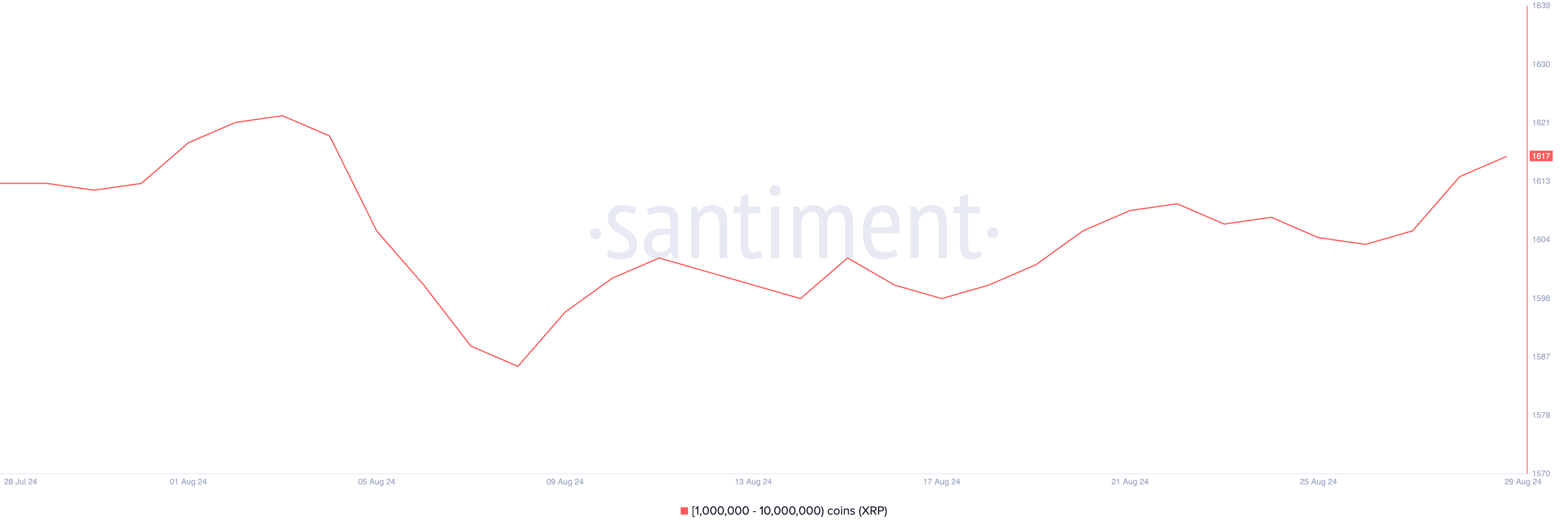 Nel periodo in esame, le whale di XRP hanno aumentato la loro attività di scambiare. I dati di Santiment mostrano un’impennata nel numero di indirizzi di whale XRP che detengono tra 1.000.000 e 10.000.000 di token XRP. Al momento della stampa, questa coorte è composta da 1617 indirizzi, con un’impennata del 2% dal 9 agosto.