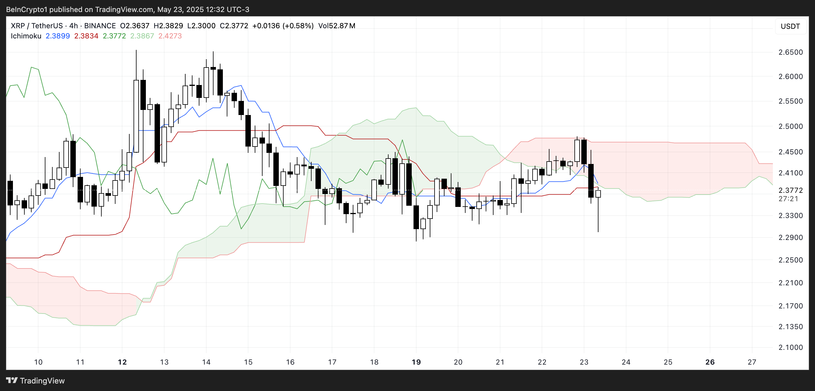 Il grafico della Ichimoku Cloud per XRP mostra un cambiamento ribassista nel momentum. Il prezzo ha rotto al di sotto sia del Tenkan-sen (linea blu) che del Kijun-sen (linea rossa), segnalando un’inversione di tendenza a breve termine.