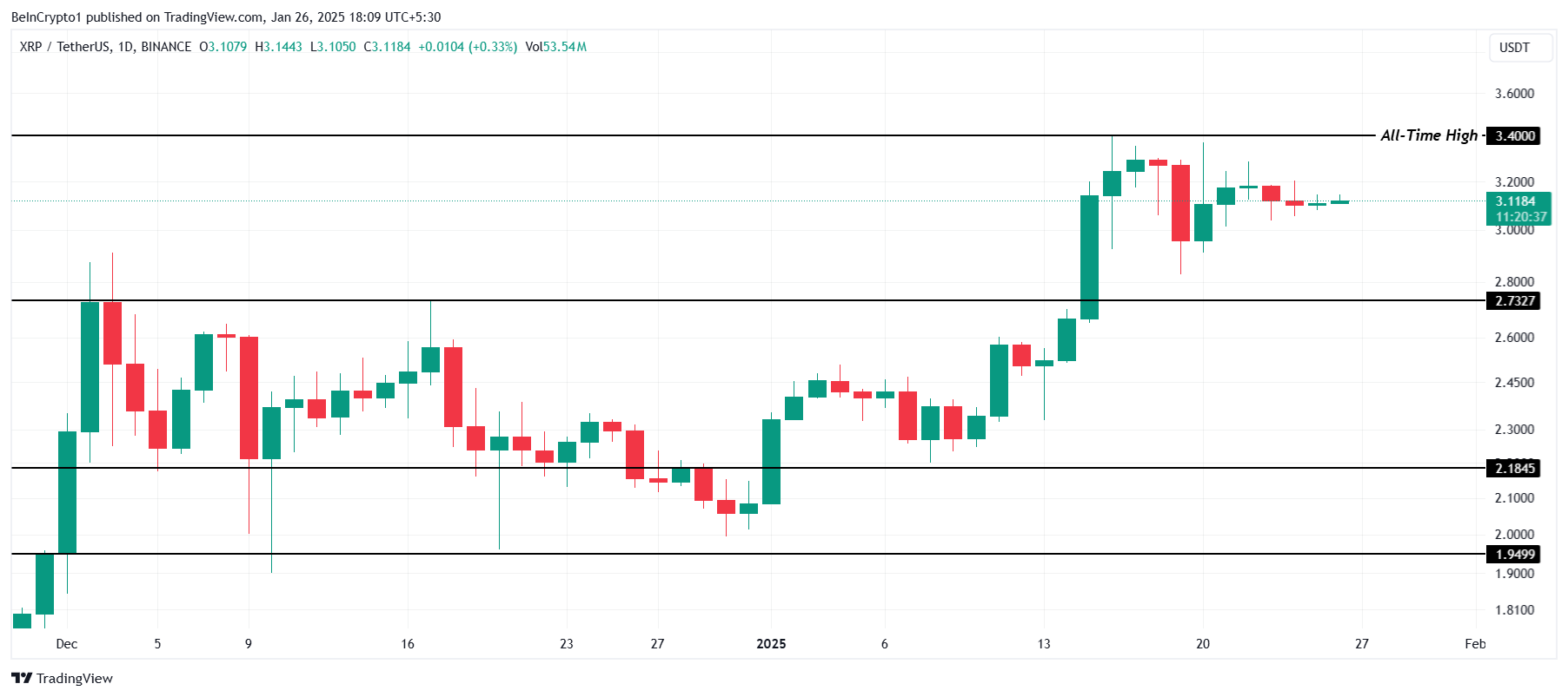 L’ATH recente di XRP di 3.40 USD non è stato seguito da una grande svendita, con il token ora scambiato a 3.11 USD. A questo livello, il prezzo sembra stabilizzarsi. Tuttavia, le tendenze attuali suggeriscono che questa stabilizzazione potrebbe essere temporanea.