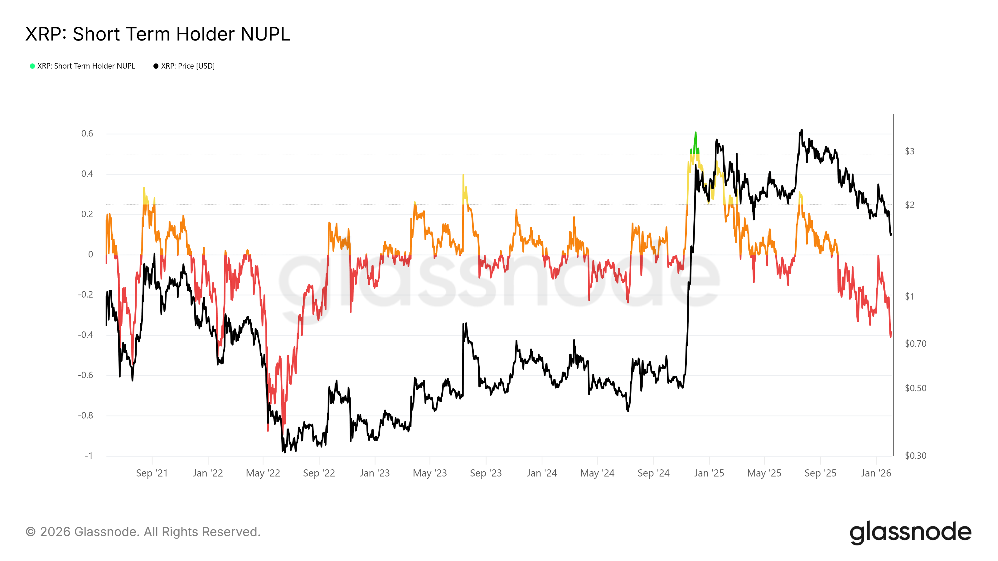 I dati on-chain mostrano come i detentori a breve termine stiano affrontando perdite non realizzate consistenti. L’indicatore STH Net Unrealized Profit and Loss si trova attualmente a -0,38. Si tratta del livello di perdita più profondo dal luglio 2022 e di un massimo a tre anni e mezzo. Questo riflette una capitolazione diffusa tra i recenti acquirenti di XRP.