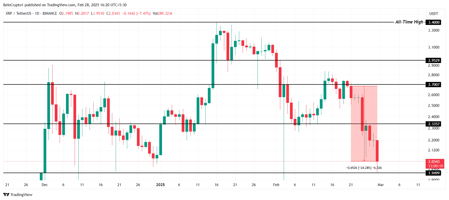 XRP ha recentemente subito un significativo ritracciamento del prezzo, principalmente a causa del trend ribassista più ampio che sta influenzando le principali criptovalute.