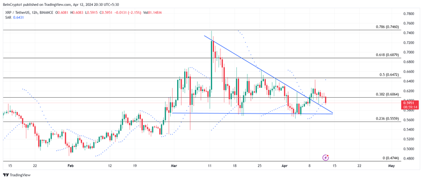 Ilprezzo di XRP, che scambia a 0,5951 dollari, sta attualmente cercando di rimanere al di sopra della linea di tendenza superiore del triangolo discendente in cui l’altcoin è bloccata. Dal mese scorso, il modello a triangolo discendente è una formazione grafica ribassista. Caratterizzato da un livello di supporto piatto e da una resistenza in calo, indica la potenziale continuazione di una tendenza al ribasso quando il prezzo rompe al di sotto del livello di supporto.