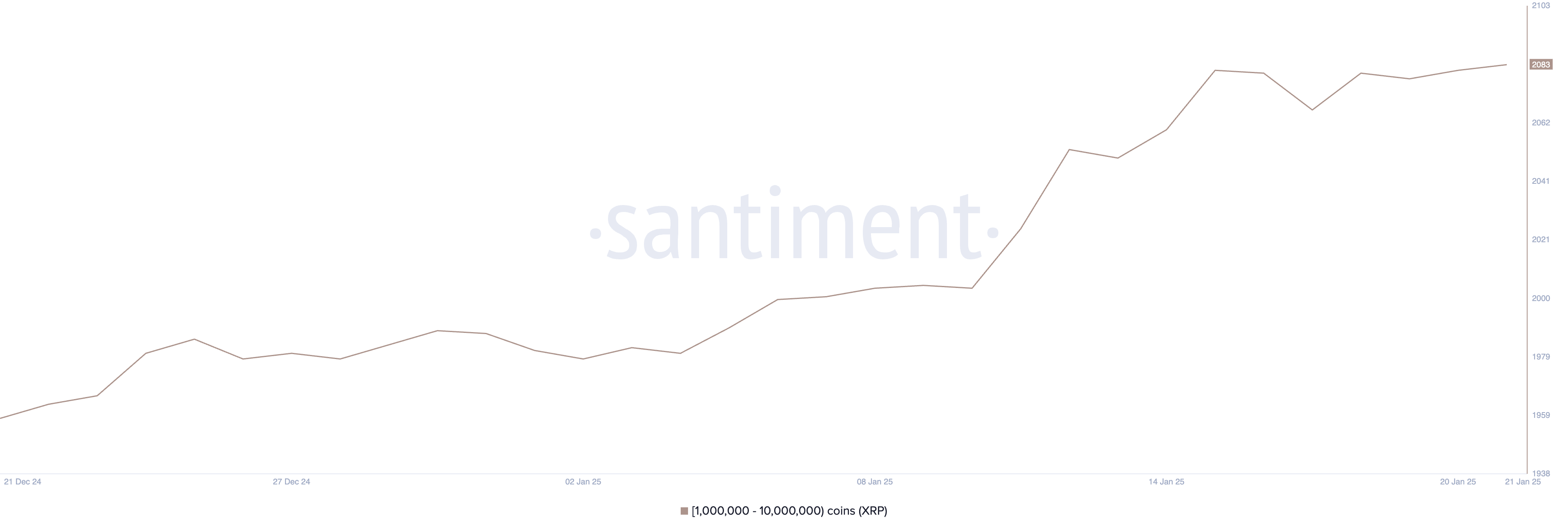 Il numero di whales di XRP, definite come indirizzi che detengono tra 1 milione e 10 milioni di XRP, ha raggiunto un massimo storico di 2.083. Questo rappresenta un traguardo importante nell’accumulazione, poiché il conteggio è in costante aumento dalla fine di dicembre.